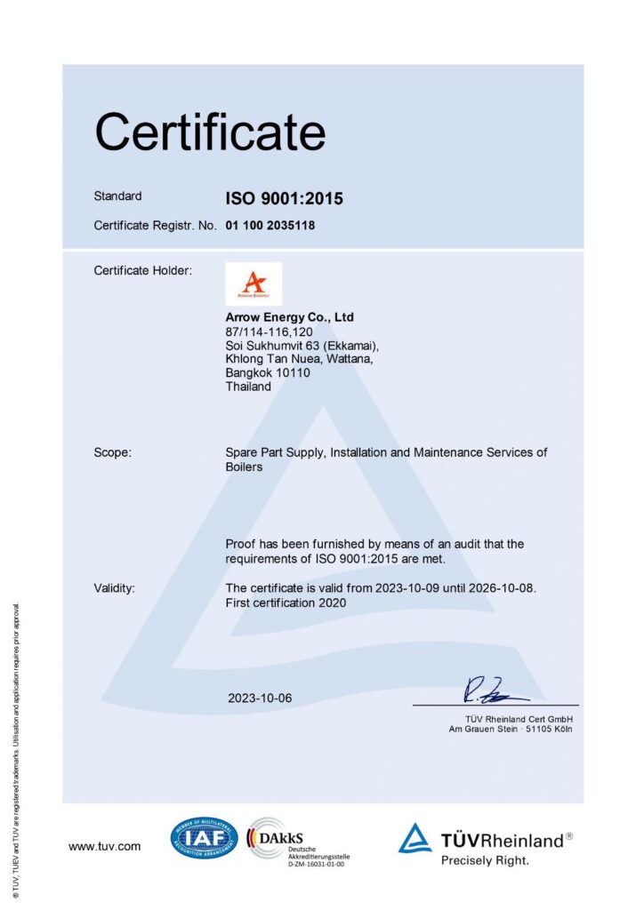 บริษัท แอร์โรว์ เอ็นเนอร์ยี่ จำกัด ภูมิใจที่ดำเนินงานภายใต้ระบบการจัดการคุณภาพ (QMS) ที่ได้รับการรับรองมาตรฐาน ISO 9001:2015 จาก TÜV Rheinland® ซึ่งการรับรองนี้แสดงถึงความมุ่งมั่นของเราในการ: